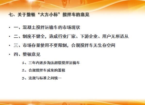 隨后,會長分析了攪拌車的市場現(xiàn)狀,制度不健全,造成行業(yè)廠家、下游企業(yè)、用戶無所適從,市場存量使用不受限制,合規(guī)攪拌車無生存空間;同時提出了建設性的整頓意見。