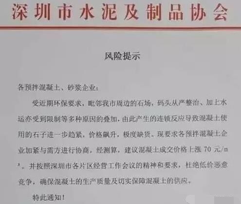受近期商品混凝土原材料(碎石、砂)持續(xù)漲價(jià)的影響,深圳市水泥及制品協(xié)會(huì)終于發(fā)布商品混凝土、預(yù)拌砂漿企業(yè)風(fēng)險(xiǎn)提示函,表示,因原材料價(jià)格持續(xù)上漲,商品混凝土價(jià)格建議,上調(diào)70元/立方米。目前,深圳市及周邊地區(qū)大多數(shù)混凝土企業(yè)混凝土價(jià)格已經(jīng)上調(diào),瘋狂的石頭再次上演【漲、漲、漲】何時(shí)能夠穩(wěn)定一來(lái),還有待觀望。