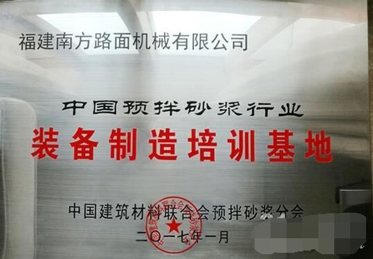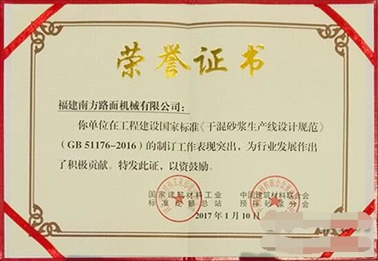 2017年1月10日,在2017'首屆中國國際預(yù)拌砂漿裝備技術(shù)研討會暨預(yù)拌砂漿綠色生產(chǎn)裝備及機械化施工技術(shù)峰會上,福建南方路面機械有限公司被中國建材聯(lián)合會預(yù)拌砂漿分會授予“中國預(yù)拌砂漿行業(yè)裝備制造培訓(xùn)基地”;同時,因在國家標(biāo)準(zhǔn)GB51176-2016《干混砂漿生產(chǎn)線設(shè)計規(guī)范》編制工作中的特殊貢獻(xiàn),被授予“特別貢獻(xiàn)單位”。