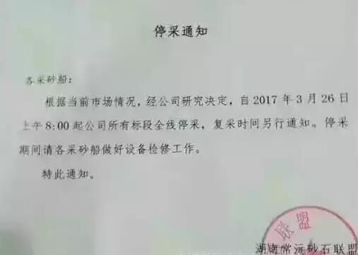 湖南常沅砂石聯(lián)盟近日發(fā)布停采通知,自2017年3月26日上午8:00起,該公司所有標段全線停采砂石,復采時間待定。這停采了,砂石供應可咋辦呢?