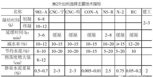 表2外加劑選擇主要技術指標