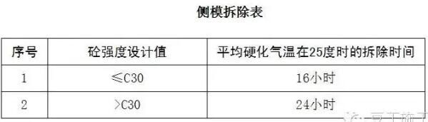 側(cè)模:在混凝土強度能保證表面棱角不因拆除模板而受損壞后,方可拆除。