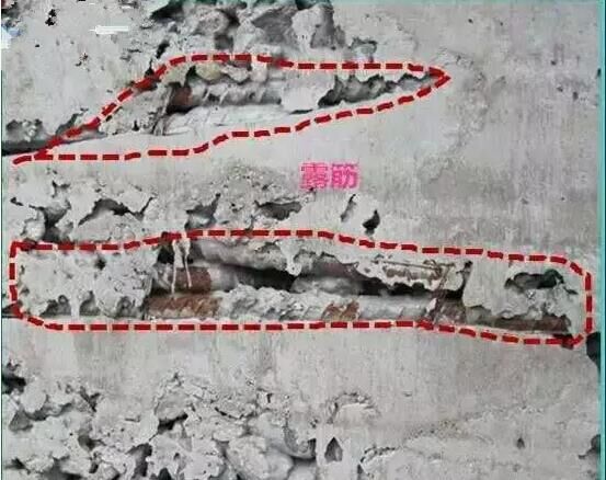 在鋼筋混凝土澆筑過程中振搗不到位,保護層墊塊沒有設(shè)置或者固定不牢固,混凝土坍落度小,或拆模早,混凝土硬化前受外力導致剝落而使構(gòu)件成型后鋼筋外露的現(xiàn)象。