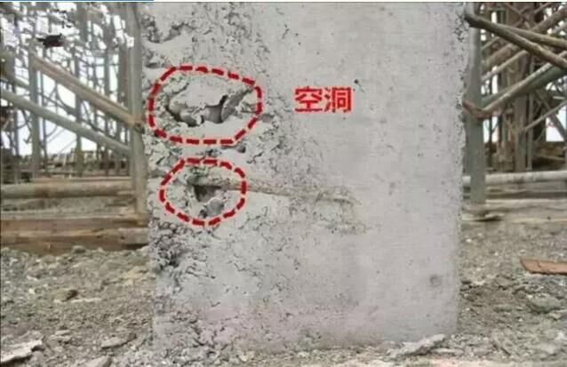 由于混凝土灌注時有一些部位堵塞不通,構(gòu)件中就會產(chǎn)生空洞,空洞不同與蜂窩,蜂窩的特征是存在于未搗實的混凝土或缺水泥漿;而空洞卻是局部或全部沒有混凝土??斩吹某叨韧ǔ]^大,以至于鋼筋全部裸露,造成構(gòu)件內(nèi)貫通的斷缺以至于結(jié)構(gòu)發(fā)生整體性破壞。