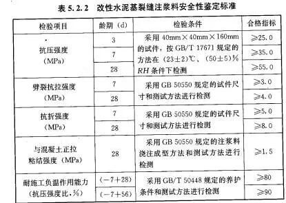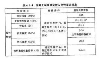 對于裂縫修補材料來說,其材料的安全性能指標,必須符合GB50728-2011《工程結構加固材料安全性鑒定技術規(guī)范》的規(guī)定: