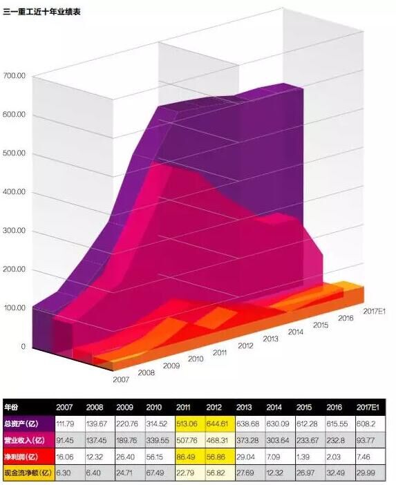 顯然,彼時三一的主營業(yè)務(wù)利潤持續(xù)大跌,倒逼著三一不得不做出改變。三一重工的財報顯示,2015年和2016年是該公司近十年來業(yè)績最差的年份,凈利潤分別為1.39億元和2.03億元。