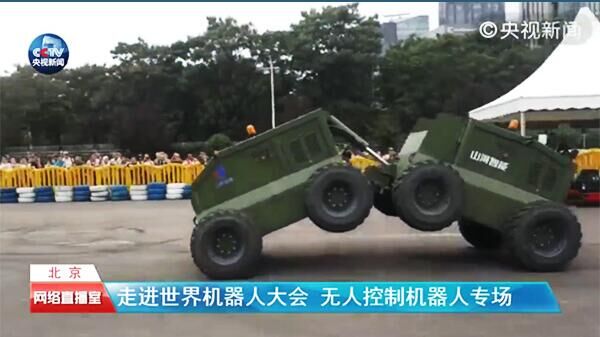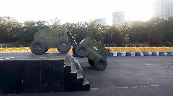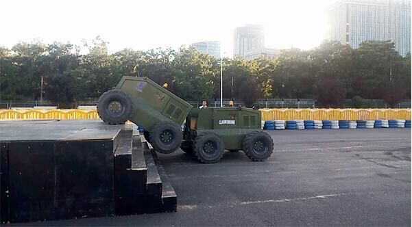在翻越障礙物的過程中,車體姿態(tài)靈活變化,輕松攀越高臺(tái),現(xiàn)場驚嘆與掌聲不斷。
