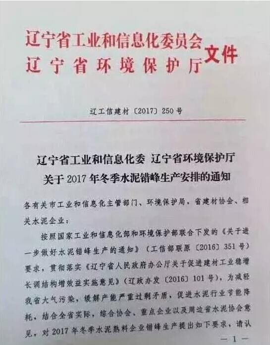 日前,遼寧省工信委和遼寧省環(huán)保廳聯(lián)合發(fā)文要求遼寧省水泥企業(yè)于今年11月開始啟動水泥行業(yè)采暖季錯峰停產(chǎn)計劃,除大連市以外的其他城市的全部水泥熟料生產(chǎn)企業(yè)錯峰停產(chǎn)6個月,錯峰生產(chǎn)自今年11月1日起停至明年春天4月末結束。