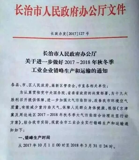 山西省長治市也發(fā)布《關于進一步做好2017-2018秋冬季工業(yè)企業(yè)錯峰生產(chǎn)和運輸?shù)耐ㄖ?。要求?017年10月1日00時起至2018年3月31日24時,水泥(含粉磨站)等建材行業(yè)企業(yè)全部停產(chǎn)。