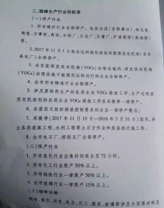 二、錯峰生產(chǎn)的時間安排:大連市停窯時間5個月,自2017年11月15日-2018年4月15日;其他城市,停窯時間6個月,自2017年11月1日-2018年4月30日。