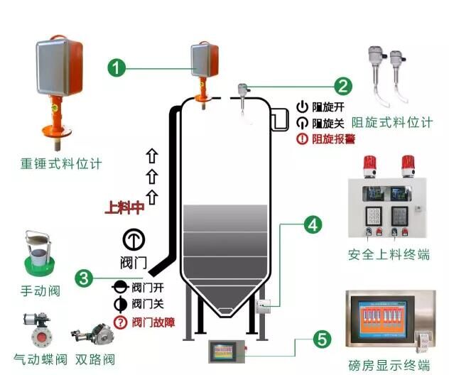 上料口側(cè):安全上料控制終端、上料安全閥,每個料倉各1個,各個終端通過網(wǎng)絡(luò)連接。