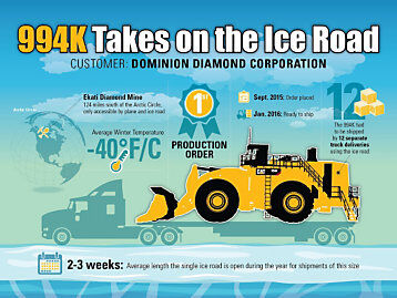 一旦機器安全到達(dá)客戶的施工現(xiàn)場,真正的樂趣就開始了。Carlos與卡特彼勒代理商芬寧加拿大分部的四名機械師合作安裝了這臺長18米的設(shè)備。Carlos非常喜歡客戶定期來到994K的安裝現(xiàn)場,客戶對在施工現(xiàn)場使用這種新型Cat裝載機的興奮勁也讓他很開心?!翱吹竭@么大的設(shè)備Dominion Diamond很興奮,他們迫不及待地希望把它派上用場?!?