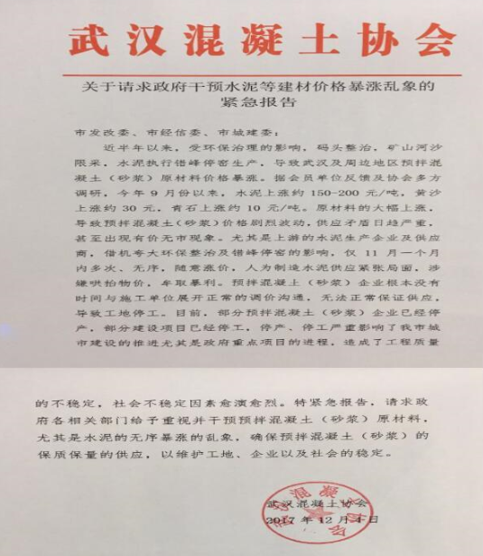 武漢混凝土協(xié)會(huì)網(wǎng)站4日發(fā)布《關(guān)于請(qǐng)求政府干預(yù)水泥等建材價(jià)格暴漲亂象的緊急報(bào)告》,《報(bào)告》表示,上游的水泥生產(chǎn)企業(yè)及供應(yīng)商借機(jī)夸大環(huán)保整治及錯(cuò)峰停窯的影響,僅11月有一個(gè)月內(nèi)多次、無序,隨意漲價(jià),人為制造水泥供應(yīng)緊張局面,涉嫌哄抬物價(jià),牟取暴利。因?yàn)閮r(jià)格原因無法正常保證混凝土(砂漿)的正常供應(yīng),部分建設(shè)項(xiàng)目已經(jīng)停工。