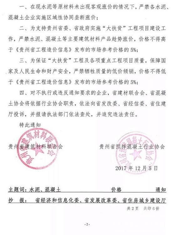 12月5日,貴州省建筑材料聯(lián)合會(huì)和貴州省預(yù)拌混凝土行業(yè)協(xié)會(huì)聯(lián)合發(fā)文《關(guān)于響應(yīng)和支持貴州省實(shí)施“大扶貧”戰(zhàn)略攻堅(jiān)階段的工作精神,嚴(yán)禁水泥、混凝土等主要建材產(chǎn)品嚴(yán)重高于<貴州省工程造價(jià)信息>市場參考價(jià)格銷售的通知》(黔協(xié)聯(lián)通字〔2017〕08號(hào))(下文稱為《通知》)。