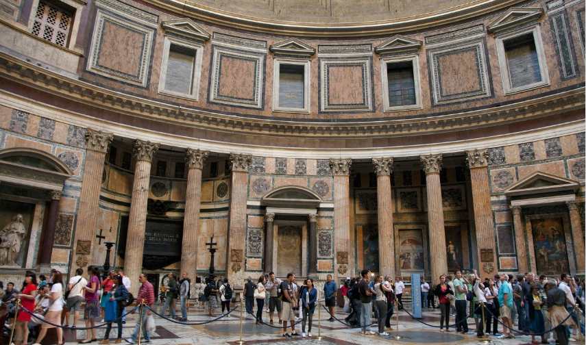 穹頂頂部的矢高和直徑一樣,也是43.3米,這樣,萬神殿的剖面恰好可以容得下一個整圓,而它的內(nèi)部墻面兩層分割也接近于黃金分割,因此它常被作為通過幾何形式達(dá)到構(gòu)圖和諧的古代實例。