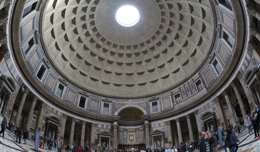 萬神殿下半部為空心圓柱形,從高度一半的地方開始,上半部為半球形的穹頂。 萬神殿的基礎(chǔ)部分底部寬7.3米,墻和穹頂?shù)撞亢襁_(dá)6米,穹頂頂部厚1.5米。為了減輕穹頂?shù)闹亓?,建筑師巧妙地在穹頂?nèi)表面作了28個凹格,分成5排,同時,在墻上有門的的前提下還開了7個凹室作為祭龕,這些祭龕里原來放的可能是神像,一些名人的墓穴。