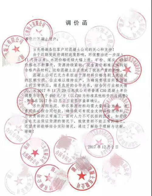 12月中旬長(zhǎng)沙地區(qū)混凝土企業(yè)向合作施工單位發(fā)布的調(diào)價(jià)函