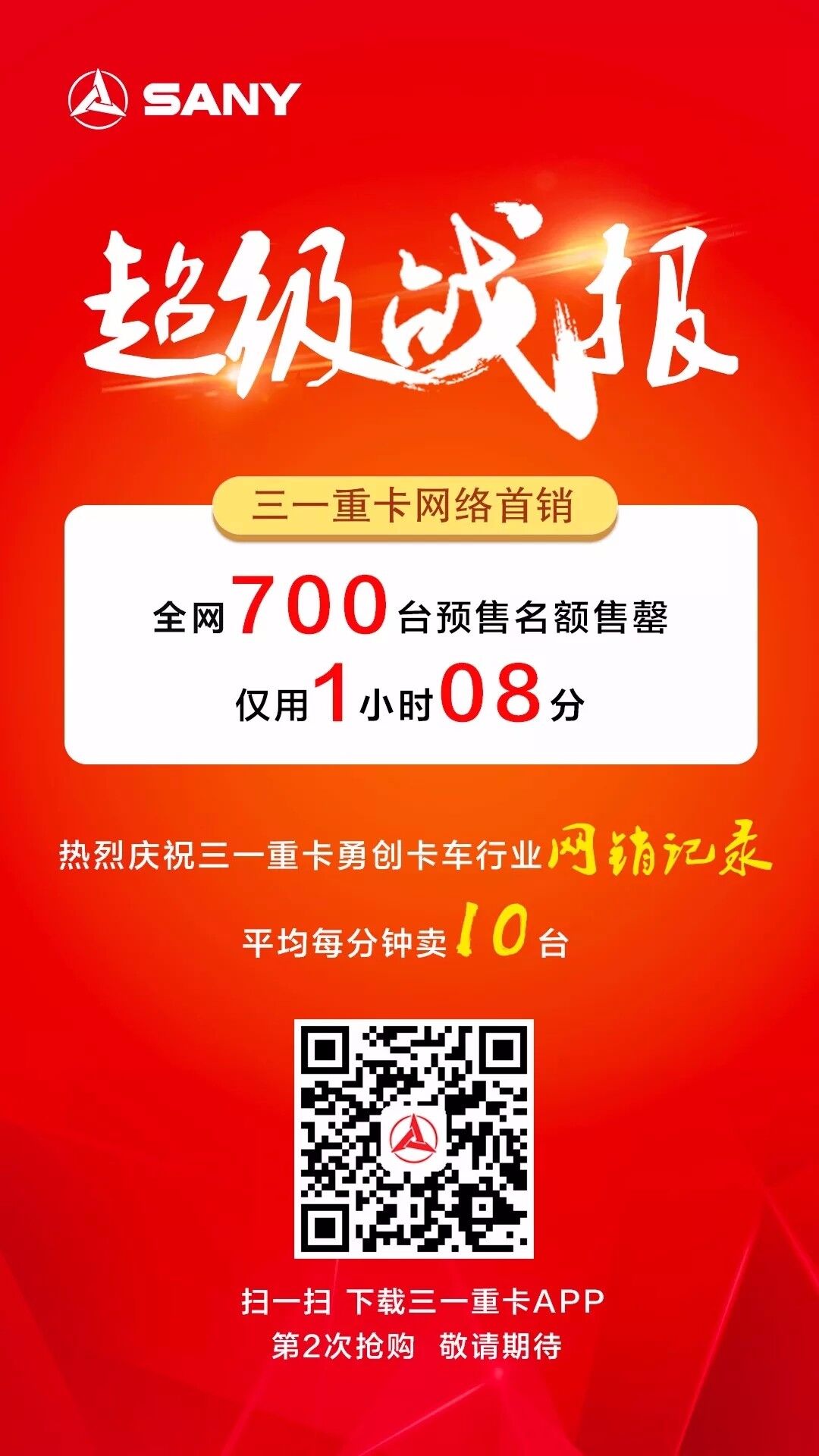 導(dǎo)語(yǔ):2018年3月31日,三一重卡首批700臺(tái)預(yù)售名額在網(wǎng)絡(luò)上鳴鑼開(kāi)賣(mài),僅用1小時(shí)8分鐘,700臺(tái)預(yù)售名額搶購(gòu)一空,不僅開(kāi)創(chuàng)了重卡廠家網(wǎng)絡(luò)直銷的先河,更是創(chuàng)造了重卡互聯(lián)網(wǎng)銷售臺(tái)數(shù)和總金額的雙重紀(jì)錄!