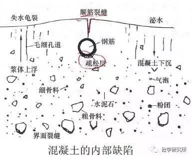 混凝土拌合物在攪拌后混合均勻,骨料下沉,混凝土中的游離水和輕物質(zhì)上浮、氣泡逸出,泌出的水分在混凝土表面聚集,這是混凝土拌合物的保水性(粘聚性)不好,這個(gè)過(guò)程會(huì)在混凝土內(nèi)部形成較多的缺陷,如: