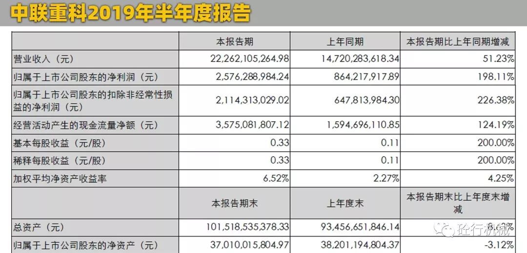 2019年上半年?duì)I業(yè)收入:222.62億元歸屬于上市公司股東凈利潤(rùn):25.76億元8月30日晚,中聯(lián)重科官方發(fā)布了2019年半年度報(bào)告。報(bào)告顯示,中聯(lián)重科上半年實(shí)現(xiàn)營(yíng)業(yè)總收入222.6億元,同比增長(zhǎng)51.23%;包括海外市場(chǎng)實(shí)現(xiàn)營(yíng)業(yè)收入16.84億元,同比增長(zhǎng)2.61%。歸屬于上市公司股東的凈利潤(rùn)25.76億元,同比增長(zhǎng)198.11%。相比較上面的徐工機(jī)械,雖然總營(yíng)業(yè)額相差了88個(gè)多億,但是,凈利潤(rùn)比徐工多了2.93億元。所以,從盈利能力來(lái)說(shuō),中聯(lián)表現(xiàn)比徐工要好。中聯(lián)重科的優(yōu)勢(shì)產(chǎn)業(yè)主要集中在混凝土機(jī)械、塔式起重機(jī)械、環(huán)衛(wèi)機(jī)械、農(nóng)業(yè)機(jī)械這四個(gè)領(lǐng)域?yàn)橹?,其中,建筑起重機(jī)械、長(zhǎng)臂架泵車(chē)保持行業(yè)第一,汽車(chē)起重機(jī)國(guó)內(nèi)市場(chǎng)份額較年初增長(zhǎng)6.8%。從目前中聯(lián)的發(fā)展趨勢(shì)來(lái)看,也在積極的擴(kuò)展高空作業(yè)平臺(tái)、土方機(jī)械、機(jī)制砂、干混砂漿、噴射機(jī)械手等新興業(yè)務(wù)。與此同時(shí),中聯(lián)重科目前也在積極轉(zhuǎn)型,打造人工智能和智能制造,中聯(lián)重科塔機(jī)智能工廠穩(wěn)步達(dá)產(chǎn),高空作業(yè)平臺(tái)臂式智能產(chǎn)線實(shí)現(xiàn)量產(chǎn),攪拌車(chē)智能制造產(chǎn)業(yè)園、液壓關(guān)鍵元件產(chǎn)業(yè)園處于規(guī)劃建設(shè)中。作為老牌的國(guó)產(chǎn)工程機(jī)械品牌,中聯(lián)重科一直以來(lái)?yè)碛泻芎玫钠放瓶诒貏e是在混凝土機(jī)械領(lǐng)域,擁有眾多的明星產(chǎn)品,碳纖維長(zhǎng)臂架泵車(chē),國(guó)內(nèi)首創(chuàng),大受市場(chǎng)歡迎。