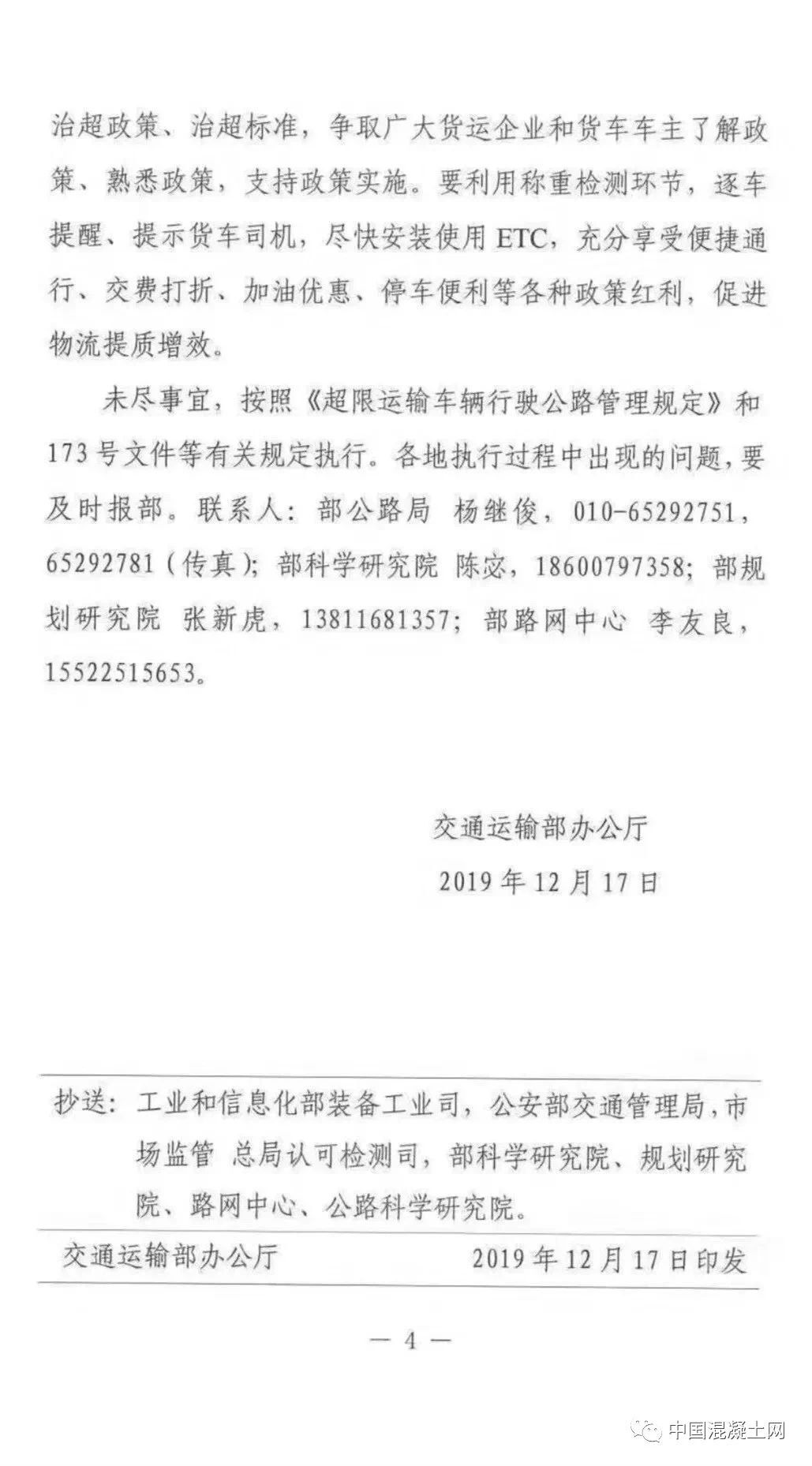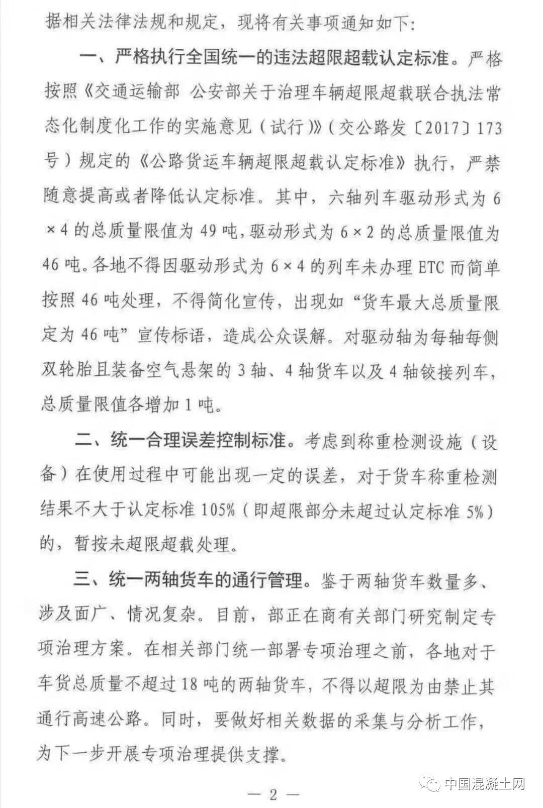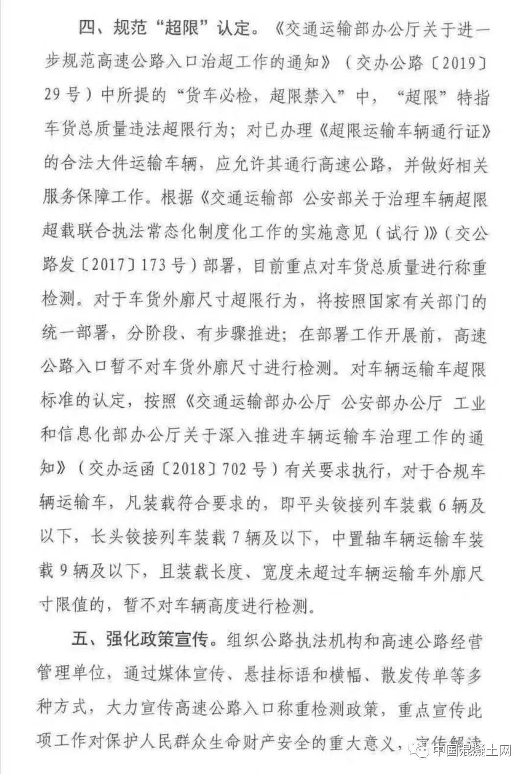 一、嚴(yán)格執(zhí)行全國統(tǒng)一的違法超限超載認(rèn)定標(biāo)準(zhǔn)。嚴(yán)格按照《交通運(yùn)輸部 公安部關(guān)于治理車輛超限超開車聯(lián)合執(zhí)法常態(tài)化制度化工作的實(shí)施意見 (試行)》(交公路發(fā)【2017】173號(hào))規(guī)定的《公路貨運(yùn)車輛超限超載認(rèn)定標(biāo)準(zhǔn)》執(zhí)行,嚴(yán)禁隨意提高或者降低認(rèn)定標(biāo)準(zhǔn)。其中,六軸列車驅(qū)動(dòng)形式為6×4的總質(zhì)量限值為49噸,驅(qū)動(dòng)形式為6×2的總質(zhì)量限值為46噸。各地不得因驅(qū)動(dòng)形式為6×4人列車未辦理ETC而簡單按照46噸處理,不得簡化宣傳,出現(xiàn)如“貨車最大總質(zhì)量限定為46噸”宣傳標(biāo)語,造成公眾誤解。對(duì)驅(qū)動(dòng)軸為每軸每則雙輪胎且裝備空氣懸架的3軸、車軸貨車以及4軸鉸接列車總質(zhì)量限值各增加1噸。二、統(tǒng)一合理誤差控制標(biāo)準(zhǔn)。考慮到稱重檢測(cè)設(shè)施(設(shè)備)在使用過程中可能出現(xiàn)一定的誤差,對(duì)于貨車稱重檢測(cè)結(jié)果不大于認(rèn)定標(biāo)準(zhǔn)105%(即超限部分未直如過認(rèn)定標(biāo)準(zhǔn)的5%)的,暫按未超限超載處理。鑒于兩軸貨車數(shù)量多、涉及面廣、情況復(fù)雜。目前,部正在商有關(guān)部門研究制定專項(xiàng)治理方案。在相關(guān)部門統(tǒng)一部署專項(xiàng)治理之前,各地對(duì)于車貨總質(zhì)量不超過18噸的兩軸貨車,不得以超限為由禁止其通行高速公路。同時(shí),要做好相關(guān)數(shù)據(jù)的采集與分析工作,為下一步開展專項(xiàng)治理提供支撐。《交通運(yùn)輸部辦公室廳關(guān)于進(jìn)一步規(guī)范高速公路入口治超工作的通知》(交辦公路【2019】29號(hào))中所提的“貨車必檢,超限禁入”中,“超限”特指車貨總質(zhì)量違法超限行為;對(duì)已辦理《超限運(yùn)輸車輛通行證》的合法大件運(yùn)輸致車輛,應(yīng)允許其通行高速公路,并做好相關(guān)服務(wù)保障工作。根據(jù)《交通運(yùn)輸部 公安部關(guān)于治理車輛超限超載聯(lián)合執(zhí)法常態(tài)化制度化工作的實(shí)施意見(試行)》(交公路發(fā)【2017】173號(hào))部署,目前重點(diǎn)對(duì)車貨總質(zhì)量進(jìn)行稱重檢測(cè)。對(duì)于車貨外廓尺寸超限行為,將按照國家有關(guān)部門的統(tǒng)一部署,分階段、有步驟推進(jìn);在部署工作開展前,高速公路入口暫不對(duì)車貨外廓尺寸進(jìn)行檢測(cè)。對(duì)車輛運(yùn)輸超限標(biāo)準(zhǔn)的認(rèn)定,按照《交通運(yùn)輸 部辦公室廳 公安部辦公室廳 工業(yè)和信息化部辦公室廳關(guān)于深入推進(jìn)車輛運(yùn)輸車治理工作的通知》(交辦運(yùn)【2018】702號(hào))有關(guān)要求執(zhí)行,對(duì)于合規(guī)車輛運(yùn)輸車,凡裝載符合要求的,即平頭鉸接列車裝載6輛及以下,長頭鉸接列車裝載7輛及以下,中置軸車輛運(yùn)輸車裝載9輛及以下,且裝載長度、寬度未超過車輛運(yùn)輸車外廓尺寸限值的,暫不對(duì)車輛高度進(jìn)行檢測(cè)。組織公路執(zhí)法機(jī)構(gòu)和高速公路經(jīng)營管理單位,通過媒體宣傳、懸掛標(biāo)語和橫幅、散發(fā)傳單等多種方式,大力宣傳高速公路入口稱重檢測(cè)政策,重點(diǎn)宣傳此項(xiàng)工作對(duì)保護(hù) 人民群眾生命財(cái)產(chǎn)安全的重大意義 ,宣傳解讀治超政策、治超標(biāo)準(zhǔn),爭取廣大貨運(yùn)企業(yè)和貨車車主了解政策、熟悉政策,支持政策實(shí)施。要利用稱重檢測(cè)環(huán)節(jié),逐車提醒、提示貨車司機(jī),盡快安裝ETC,充分享受便捷通行、交費(fèi)打折、加油優(yōu)惠、車便利等各種政策紅利,促進(jìn)物流提質(zhì)增效。未盡事宜,按照《超限運(yùn)輸車輛行駛公路管理規(guī)定》和173號(hào)文件等有關(guān)規(guī)定執(zhí)行。各地執(zhí)行過程中出現(xiàn)的要及時(shí)報(bào)部。全國物流標(biāo)準(zhǔn)非?;靵y,地方標(biāo)準(zhǔn)與國家標(biāo)準(zhǔn)經(jīng)?!按蚣堋?,導(dǎo)致全國物流司機(jī)苦不堪言,而此次交通廳像各省運(yùn)輸廳發(fā)布特急文件通知,劍指就是統(tǒng)一運(yùn)輸車輛載重的標(biāo)準(zhǔn),令運(yùn)輸行業(yè)向制度化,規(guī)范化過渡。同時(shí)從根源上徹底清除“亂收費(fèi)”現(xiàn)象,并發(fā)布問題反映電話:部科學(xué)研究院:陳宓 18600797358部規(guī)劃院:張新虎 13811681357部路網(wǎng)中心:李友良 15522515653