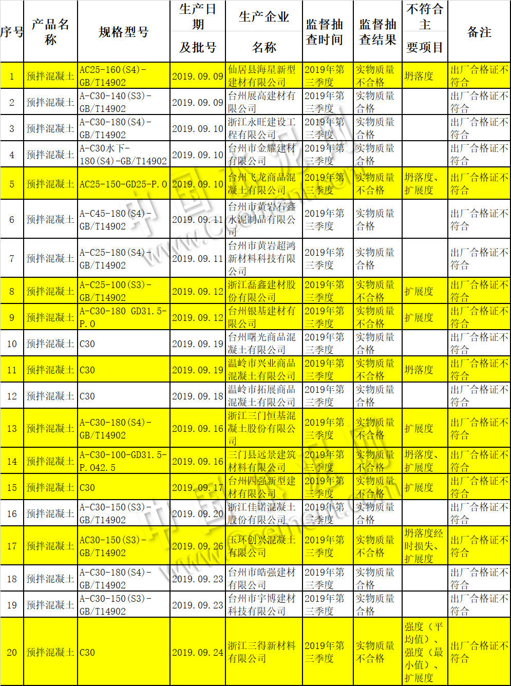 12月24日,臺(tái)州市市場(chǎng)監(jiān)督管理局官網(wǎng)發(fā)布2019年預(yù)拌混凝土產(chǎn)品質(zhì)量專項(xiàng)監(jiān)督抽查結(jié)果信息。近期,根據(jù)《中華人民共和國產(chǎn)品質(zhì)量法》、《浙江省產(chǎn)品質(zhì)量監(jiān)督條例》的規(guī)定,臺(tái)州市市場(chǎng)監(jiān)督管理局組織開展了2019年臺(tái)州市預(yù)拌混凝土產(chǎn)品質(zhì)量專項(xiàng)監(jiān)督抽查,涉及到臺(tái)州市有20家企業(yè)的20批次產(chǎn)品,其中實(shí)物質(zhì)量不合格10批次,實(shí)物質(zhì)量不合格率為50%。主要不符合項(xiàng)目為:強(qiáng)度、坍落度、坍落度經(jīng)時(shí)損失、擴(kuò)展度。本次專項(xiàng)監(jiān)督抽查發(fā)現(xiàn)合格證普遍存在不符合現(xiàn)象。