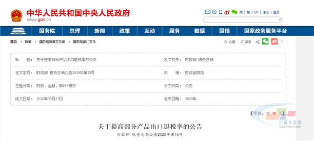 日前,中央人民政府網(wǎng)站發(fā)布了財(cái)政部、稅務(wù)總局聯(lián)合印發(fā)的關(guān)于提高部分產(chǎn)品出口退稅率的公告。本公告自2020年3月20日起實(shí)施。本公告所列貨物適用的出口退稅率,以出口貨物報(bào)關(guān)單上注明的出口日期界定。