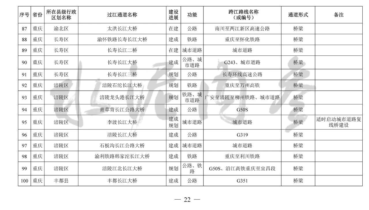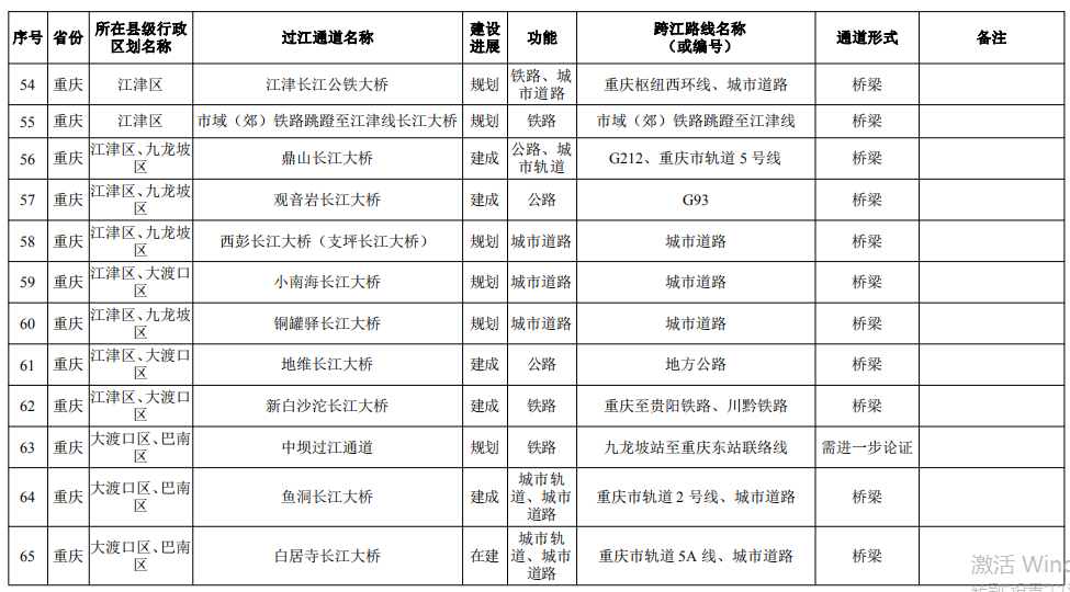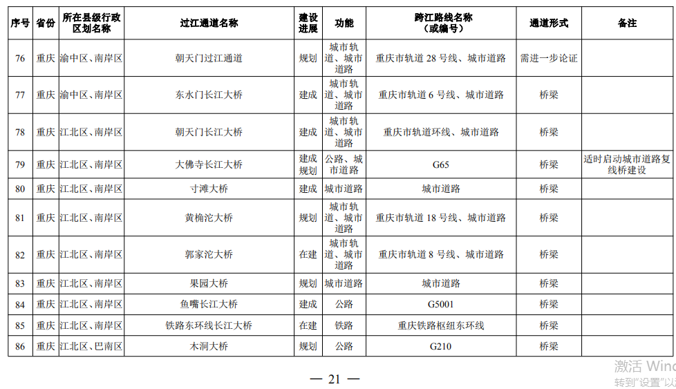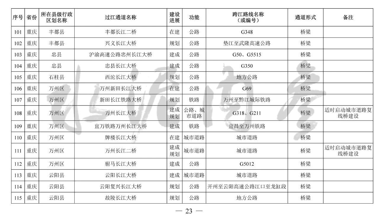 重慶市(17座):市域(郊)鐵路跳蹬至江津線長(zhǎng)江大橋、西彭長(zhǎng)江大橋(支坪長(zhǎng)江大橋)、小南海長(zhǎng)江大橋、中壩過(guò)江通道、黃桷坪長(zhǎng)江大橋、軌道27號(hào)線過(guò)江通道、重慶至黔江鐵路過(guò)江通道、黃桷沱大橋、長(zhǎng)壽長(zhǎng)江三橋、涪陵石沱長(zhǎng)江大橋、涪陵龍頭港長(zhǎng)江大橋、涪陵江北長(zhǎng)江大橋、興義長(zhǎng)江大橋、西沱長(zhǎng)江大橋、云陽(yáng)復(fù)興長(zhǎng)江大橋、奉節(jié)二橋、巫山長(zhǎng)江二橋