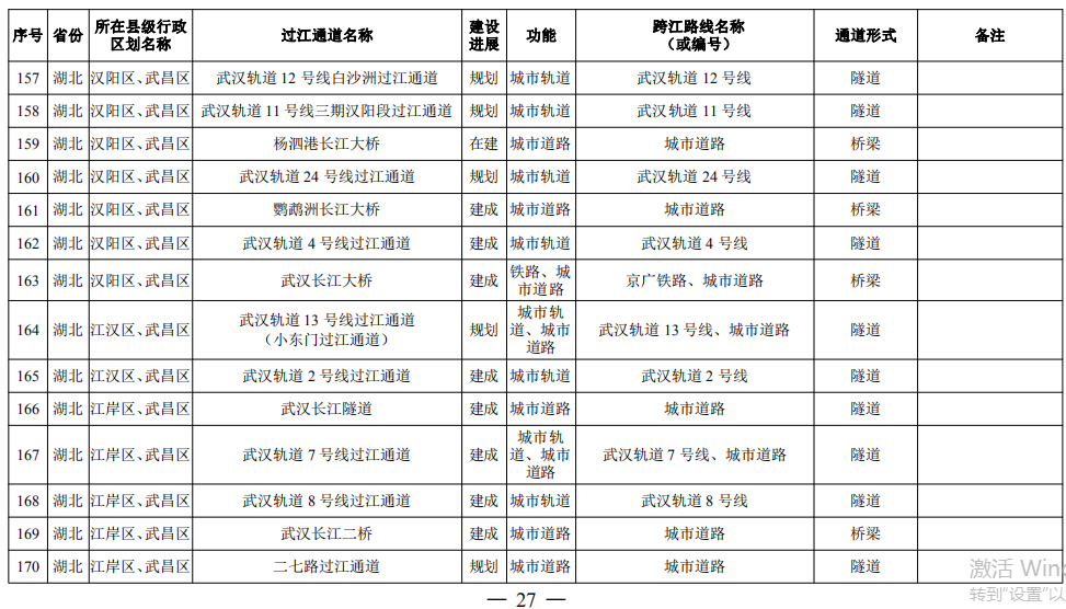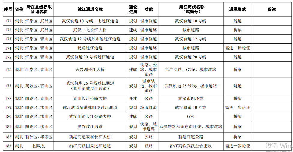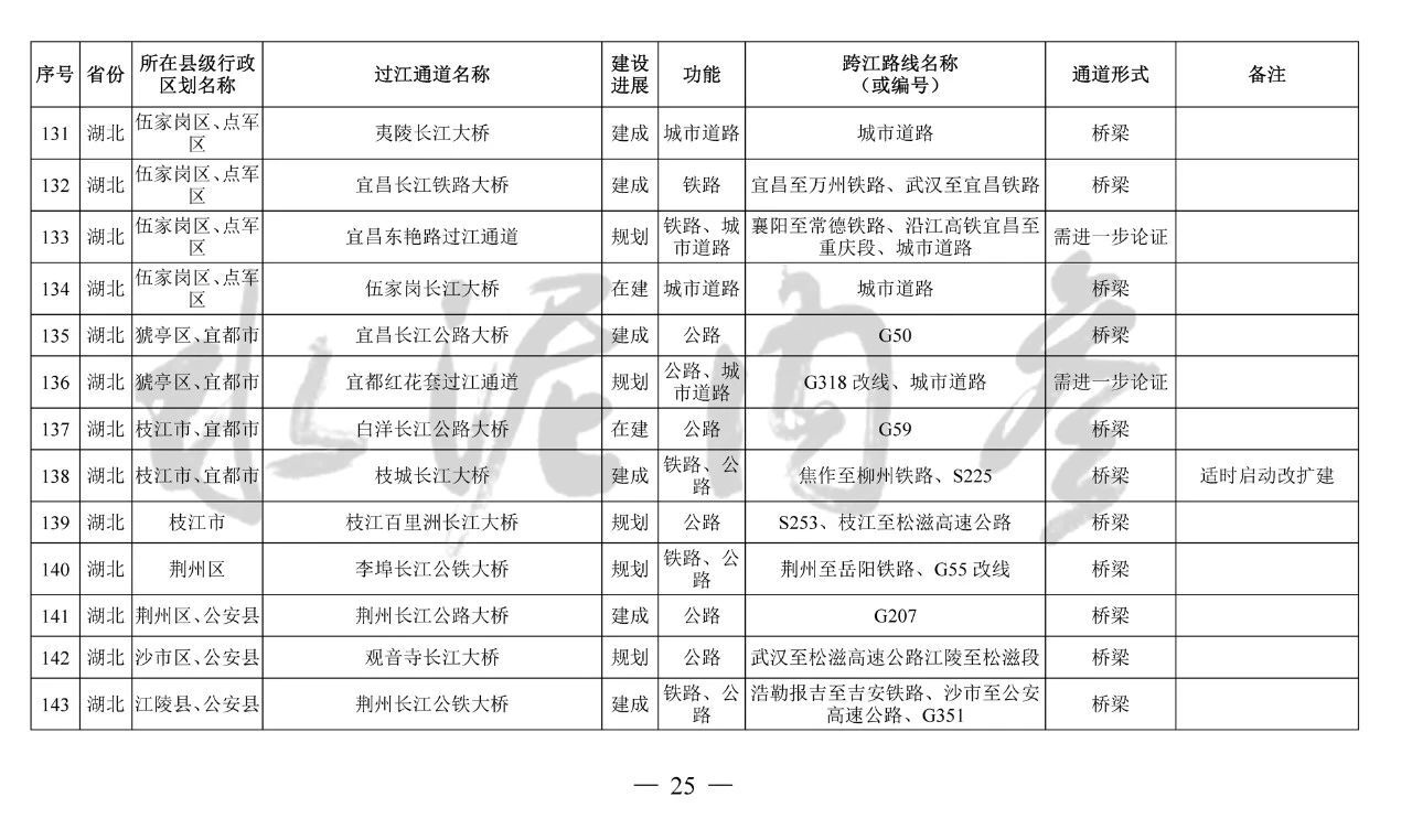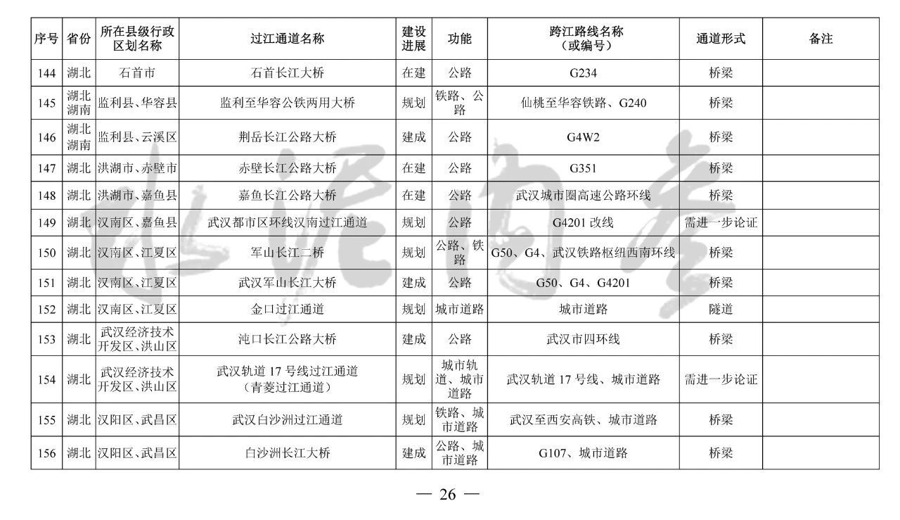 湖北?。?4座):巴東長(zhǎng)江公路二橋、興山至長(zhǎng)陽(yáng)高速公路過(guò)江通道、宜昌東艷路過(guò)江通道、宜都紅花套過(guò)江通道、枝江百里洲長(zhǎng)江大橋、李埠長(zhǎng)江公鐵大橋、觀音寺長(zhǎng)江大橋、武漢都市區(qū)環(huán)線漢南過(guò)江通道、軍山長(zhǎng)江二橋、武漢軌道17號(hào)線過(guò)江通道(青菱過(guò)江通道)、武漢白沙洲過(guò)江通道、武漢軌道12號(hào)線白沙洲過(guò)江通道、武漢軌道11號(hào)線三期漢陽(yáng)段過(guò)江通道、武漢軌道13號(hào)線過(guò)江通道(小東門(mén)過(guò)江通道)、二七路過(guò)江通道、武漢軌道10號(hào)線二七過(guò)江通道、武漢軌道12號(hào)線丹水池過(guò)江通道、堤角過(guò)江通道、武漢軌道20號(hào)線過(guò)江通道、武漢軌道25號(hào)線過(guò)江通道(長(zhǎng)江新城過(guò)江通道)、武漢軌道新港線陽(yáng)邏過(guò)江通道、光谷過(guò)江通道、新港高速雙柳長(zhǎng)江大橋、鄂黃第二過(guò)江通道鄂湘界(1座):監(jiān)利至華容公鐵兩用大橋