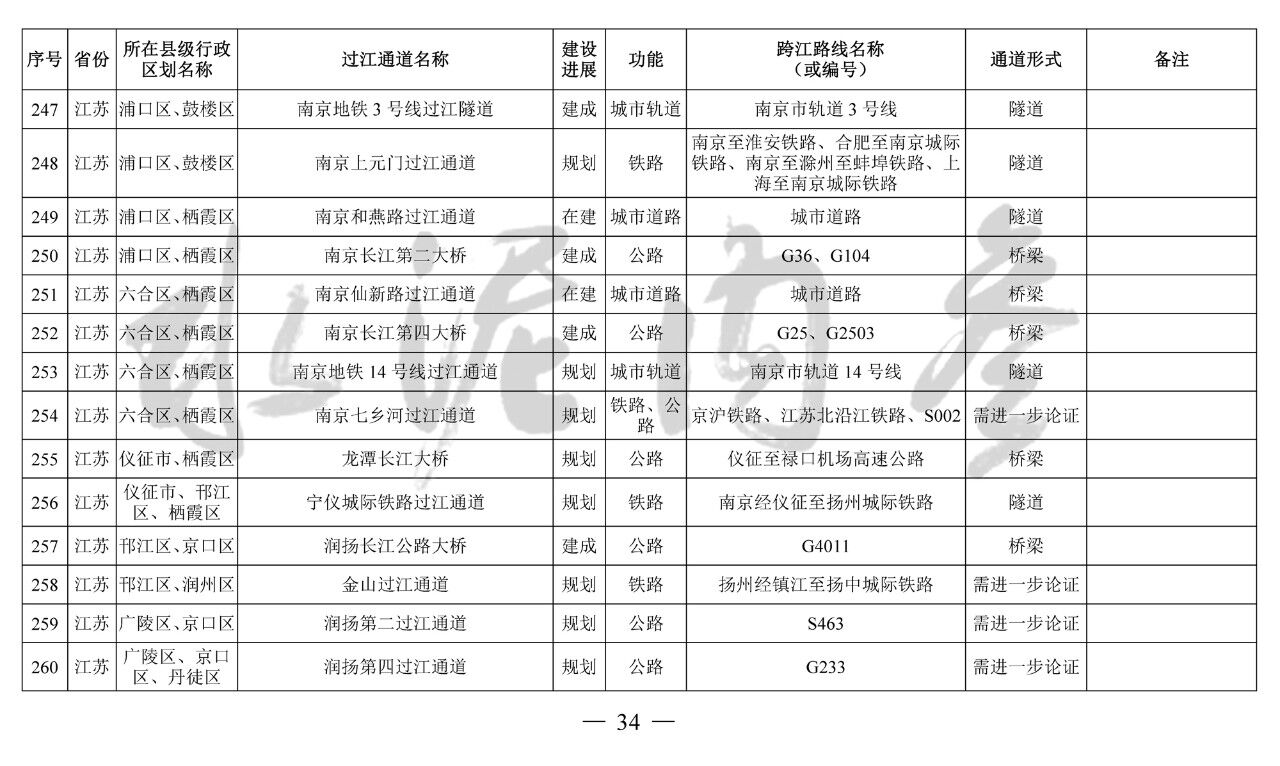 江蘇?。?3座):錦文路過(guò)江通道、南京地鐵4號(hào)線過(guò)江通道、南京市域快速軌道過(guò)江通道、南京上元門(mén)過(guò)江通道、南京七鄉(xiāng)河過(guò)江通道、龍?zhí)堕L(zhǎng)江大橋、寧儀城際鐵路過(guò)江通道、潤(rùn)揚(yáng)第二過(guò)江通道、江陰第二過(guò)江通道、江陰第三過(guò)江通道、張皋過(guò)江通道、蘇通第二過(guò)江通道、海太過(guò)江通道