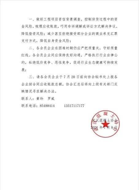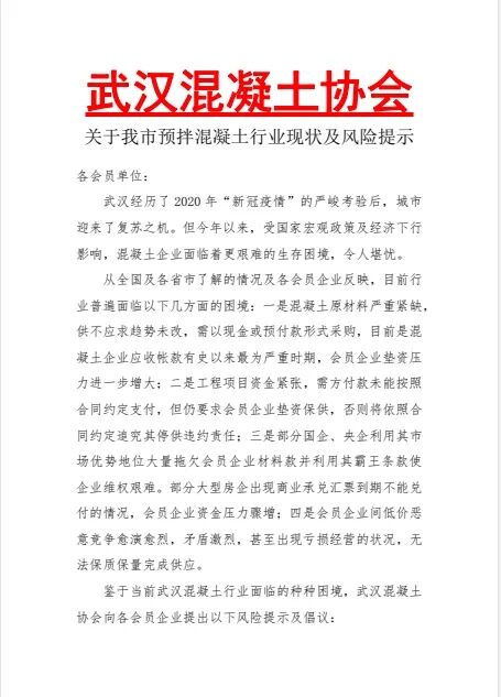 鑒于當(dāng)前武漢混凝土行業(yè)面臨的種種困境,武漢混凝土協(xié)會向各會員企業(yè)提出以下風(fēng)險提示及倡議∶