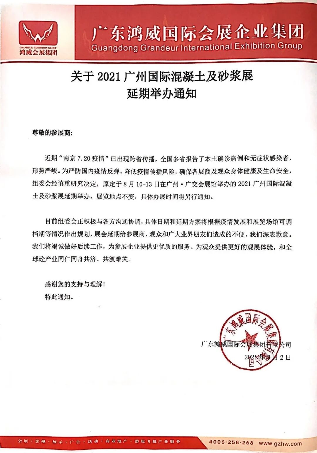 由于當前國內(nèi)多地出現(xiàn)新型冠狀病毒肺炎新增確診病例、中高風(fēng)險地區(qū)不斷增加的疫情嚴峻形勢影響,為全力配合做好疫情防控工作,避免大規(guī)模聚集和降低疫情傳播風(fēng)險,保障參展商、觀眾及工作人員健康安全,維護參展單位權(quán)益,確保展會效果,組委會經(jīng)慎重研究決定,原定于8月10-13日在廣州·廣交會展館舉辦的2021廣州國際混凝土及砂漿展延期舉辦,展覽地點不變,具體辦展時間將另行通知。