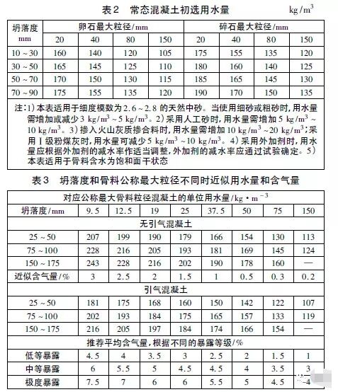 1)根據(jù)混凝土的暴露等級(jí)決定其是否需要引氣,再分別針對(duì)引氣混凝土和無引氣混凝土,根據(jù)施工要求的工作度和骨料最大粒徑初選用水量和含氣量;
