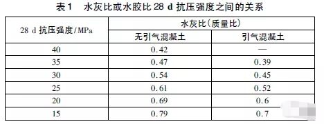 當(dāng)無試驗(yàn)資料可用時(shí),對(duì)于含有Type1波特蘭水泥(硅酸鹽水泥)的混凝土,可以在表1中得到近似和相對(duì)固定的數(shù)據(jù)。用有代表性的材料,在試驗(yàn)室標(biāo)準(zhǔn)養(yǎng)護(hù)條件下試驗(yàn)28d的試塊,表1中的水膠比可以得到與之對(duì)應(yīng)的強(qiáng)度。