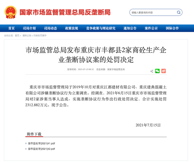 2021年7月15日,市場監(jiān)管總局發(fā)布重慶市豐都縣2家商砼生產企業(yè)壟斷協(xié)議案的處罰決定。處罰決定顯示,合計實施處罰2312.882萬元。