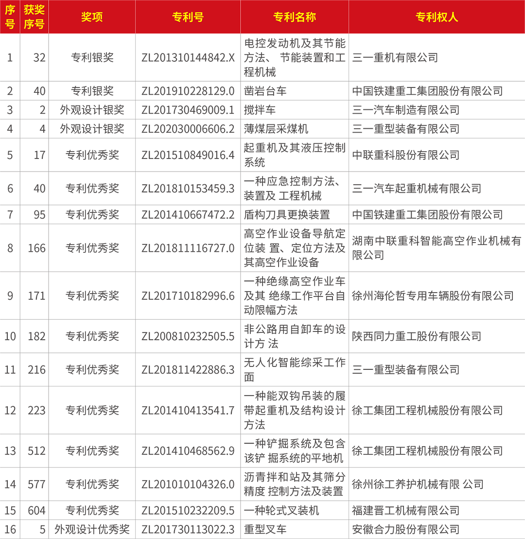 本屆評(píng)選活動(dòng)中,中國工程機(jī)械行業(yè)共有十六項(xiàng)專利榮獲“中國專利獎(jiǎng)”,其中兩項(xiàng)獲專利銀獎(jiǎng),兩項(xiàng)獲外觀設(shè)計(jì)銀獎(jiǎng),十一項(xiàng)獲專利優(yōu)秀獎(jiǎng),一項(xiàng)獲外觀設(shè)計(jì)優(yōu)秀獎(jiǎng)。