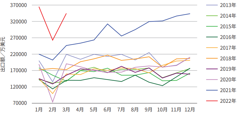 根據(jù)海關(guān)數(shù)據(jù)整理,2021年1-3月我國工程機械進出口貿(mào)易額為105.08億美元,同比增長36%。其中進口金額7.85億美元,同比下降22.8%;出口金額97.23億美元,同比增長45%,貿(mào)易順差89.38億美元,同比增加32.49億美元。2022年1-3月各月進出口情況如表1所示,2013年-2022年月度出口金額如圖1所示。