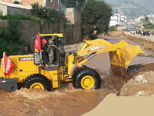 徐工救援隊員早已為車輛做好了一切前期準備,按照指揮部安排,此臺徐工LW500FN裝載機參與清理災(zāi)區(qū)因塌方被堵塞的河道,并在河道中進行鋪設(shè)快速通道工作,從河道中央開出一條水上救援之路。至上午11點,徐工裝載機高效出色地順利完成了任務(wù),不僅排除了水災(zāi)隱患,更在河道中修出一條“生命線”,使后續(xù)救護車、武警車等救援車輛可以通過這條簡易通道直抵震中,為被困被埋群眾在72小時黃金救援時間內(nèi)獲救爭取到了更多時間。