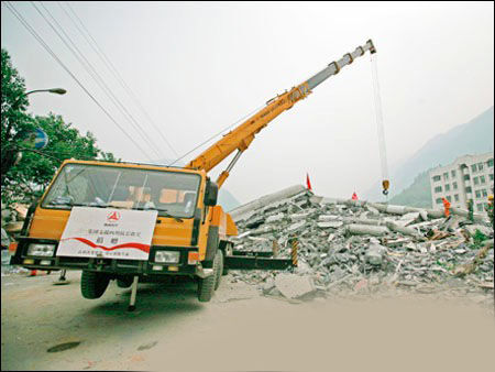三一7臺挖掘機、8臺起重機以及80多名具有設(shè)備操作經(jīng)驗的青年員工組成抗震救災志愿者突出隊,受命開赴災區(qū)。
