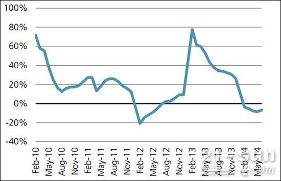 2014年上半年,商品房銷售面積累計(jì)下降6%,銷售額下降7%,房屋新開(kāi)工面積累計(jì)同比下降16.5%;房屋施工面積累計(jì)同比增長(zhǎng)11.3%,增速較2013年的16.1%明顯下降。展望2014年下半年,由于2013年下半年商品房銷售面積達(dá)7.9億平米,絕對(duì)水平較高,因此該行預(yù)計(jì)下半年銷售面積下降幅度有擴(kuò)大的可能,從而壓制開(kāi)發(fā)商的房地產(chǎn)建設(shè)活動(dòng)。