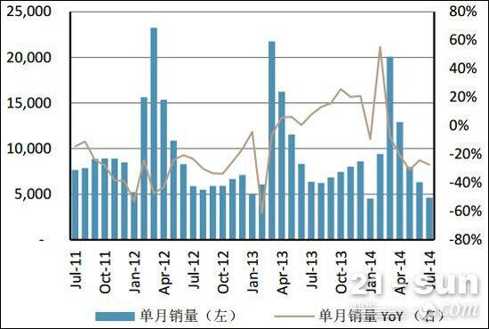 瑞銀表示,行業(yè)整體景氣度并未好轉(zhuǎn),下滑之勢(shì)未改。2013年4月開(kāi)始,土方機(jī)械單月銷量增速由負(fù)轉(zhuǎn)正,其中挖機(jī)銷量在2013年四季度實(shí)現(xiàn)了超過(guò)20%的增長(zhǎng),裝載機(jī)在8月后亦實(shí)現(xiàn)了超過(guò)15%的月均銷量增長(zhǎng)。但進(jìn)入2014年以來(lái),由于房地產(chǎn)銷售及新開(kāi)工不佳,2014年3月,挖掘機(jī)和裝載機(jī)銷量分別下滑8%和4%,結(jié)束了11個(gè)月的正增長(zhǎng)。此后4-7月,跌幅持續(xù)擴(kuò)大,其中7月挖機(jī)銷量下降27%,裝載機(jī)銷量下滑20%。