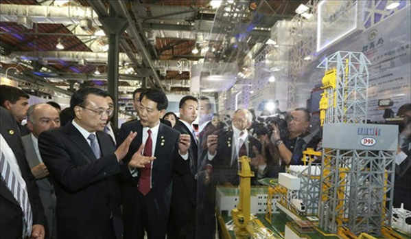 當?shù)貢r間20日,李克強在里約熱內(nèi)盧州州長佩藏和巴西外長維埃拉的陪同下來到里約民港碼頭,參觀正在這里舉辦的中國裝備制造業(yè)展覽,并為展覽開幕剪彩。展覽包括鐵路及軌道交通、電力、通信、金融等10個板塊,代表國內(nèi)裝備制造業(yè)最高水平的30家中國企業(yè)參展。