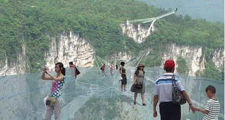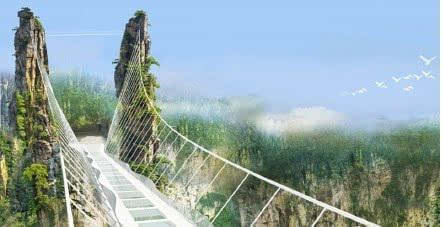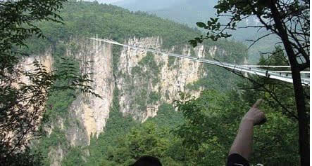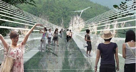 號稱世界最長、最高的全透明玻璃橋———據(jù)遺產(chǎn)日報: 張家界大峽谷玻璃橋?qū)⒂?月向游客開放。玻璃橋總長430米、寬6米,橋面距谷底約300米,可站800人。整個工程無鋼筋混凝土橋墩,同時肩負(fù)蹦極、溜索、舞臺等多種功能。