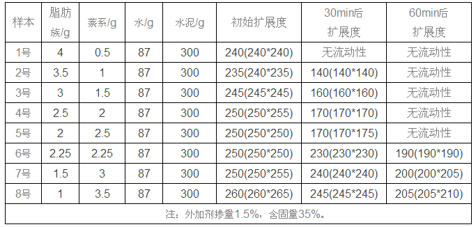 根據(jù)《混凝土外加劑勻質(zhì)性試驗方法》GB/T8077-2012規(guī)定的試驗方法:水泥300g;水87g。本文外加劑摻量按1.5%(即4.5g)為基準(zhǔn),逐步進(jìn)行調(diào)整,直至找到最優(yōu)復(fù)配比例。