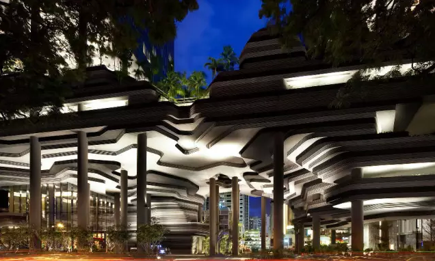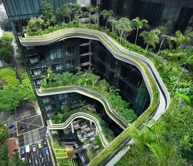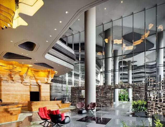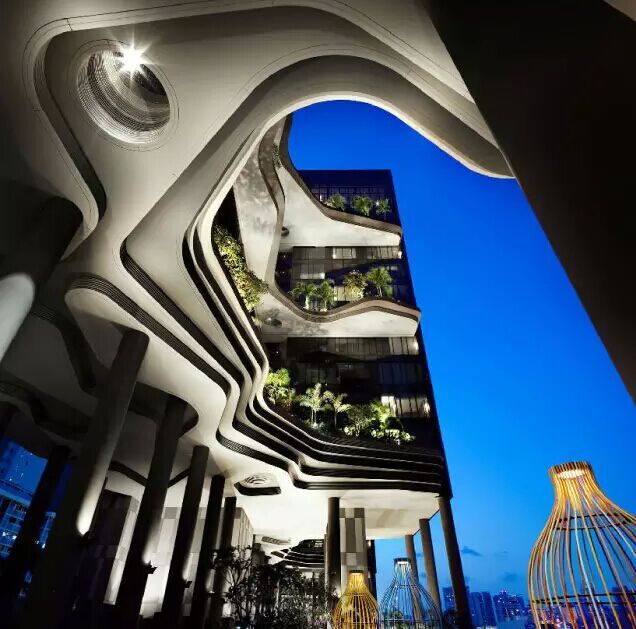 建筑流動(dòng)的幾何體給人一種高聳入云之感,塔樓每隔三層客房擁有懸挑的空中花園,上面種滿了熱帶植物,它已成為城市綠地的一部分,與鄰近公園融為一體。酒店擁有自我遮陽(yáng)功能,懸挑而出的空中花園和相鄰的三座酒店客房大樓都能起到遮陽(yáng)的作用,客房樓層立面采用低輻射玻璃。酒店頂樓的屋頂花園可將全城風(fēng)光一覽無(wú)余,獨(dú)家蘭花貴賓會(huì)所位處該層,并配有私人會(huì)議空間、圖書館和專用的貴賓會(huì)所門房。酒店五層設(shè)有可俯瞰城市的無(wú)邊界泳池,設(shè)備先進(jìn)的健身中心,特色的鳥(niǎo)籠休息涼亭及長(zhǎng)達(dá)300米花園走道。