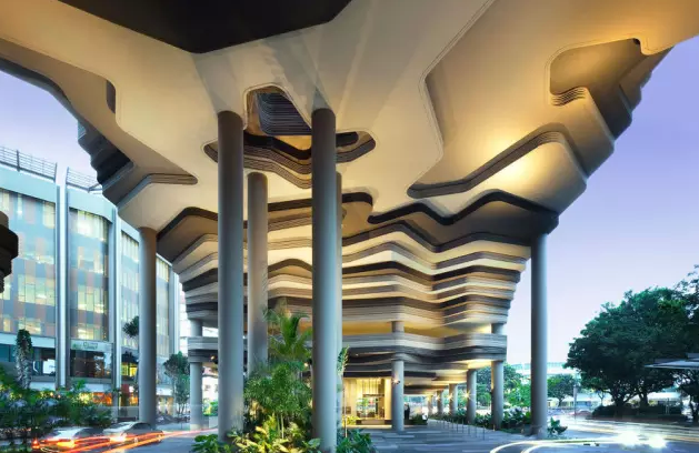 酒店位于其中心商業(yè)區(qū),是新加坡WOHA建筑事務(wù)所的杰作,負(fù)責(zé)景觀設(shè)計(jì)的為Tierra事務(wù)所。皮克林賓樂(lè)雅采用花園酒店理念,貫徹節(jié)能,已獲新加坡綠色建築最高榮譽(yù)BCA綠色建築白金獎(jiǎng),因其為首間使用太陽(yáng)能酒店,獲得太陽(yáng)能先鋒獎(jiǎng)。酒店樓高16層,12層高的塔樓坐落在5層高裙樓樓頂上,塔樓每隔三層懸挑一座空中花園。裙樓被波狀預(yù)制混凝土包圍,WOHA稱之為地形建筑、會(huì)呼吸的建筑。