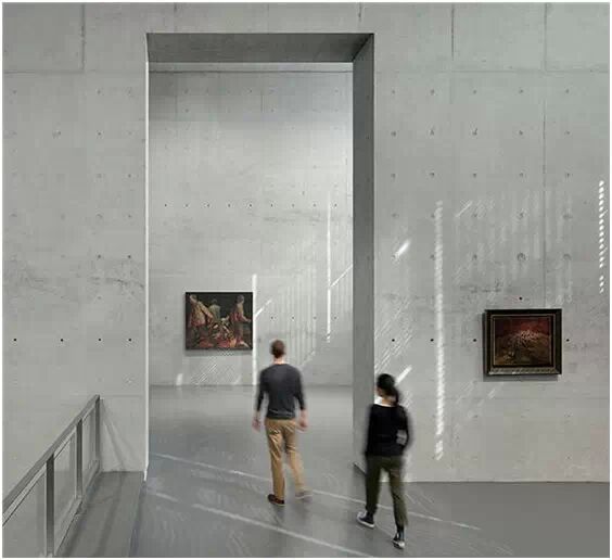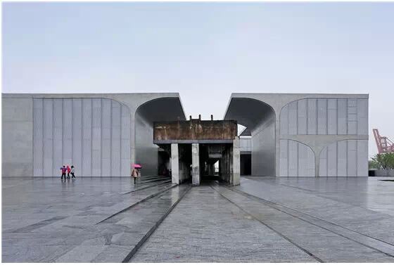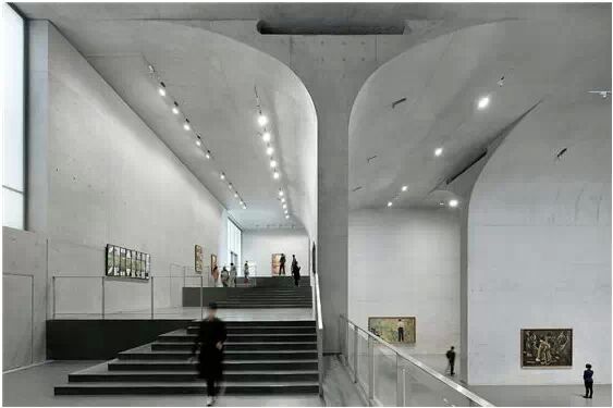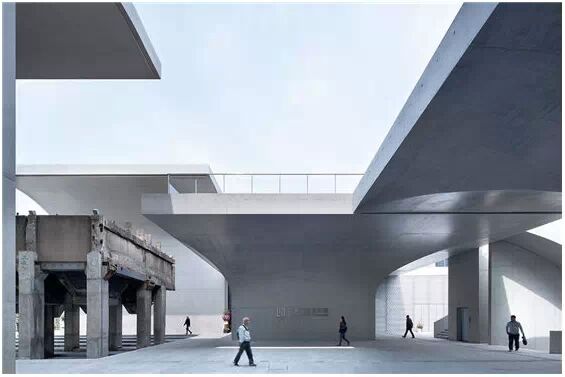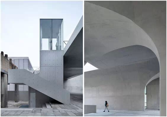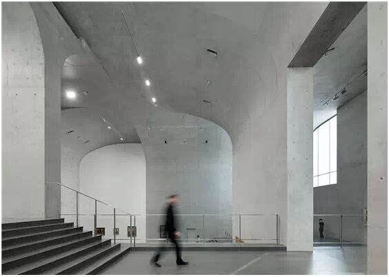 在“傘拱”結(jié)構(gòu)的空腔里,地面以上的“傘拱”覆蓋空間,墻體和天花均為清水混凝土的表面,它們的幾何分界位置也變得模糊。這樣的結(jié)構(gòu)性空間,在形態(tài)上不僅對(duì)人的身體形成庇護(hù)感,亦與保留的江邊碼頭的煤料斗產(chǎn)生視覺(jué)呼應(yīng)。建筑的內(nèi)部空間也得以呈現(xiàn)一種原始的野性魅力,而有著大小調(diào)節(jié)的空間尺度以及留有模板拼縫和螺栓孔的清水混凝土表面又會(huì)帶來(lái)一種現(xiàn)實(shí)感。這種“直白”式的結(jié)構(gòu)、材料、空間所形成的直接性與樸素性,加上大尺度出挑所產(chǎn)生的力量感或輕盈感,使整個(gè)建筑與原有場(chǎng)地的工業(yè)特質(zhì)間取得一種時(shí)間與空間的接續(xù)關(guān)系。地面以上的清水混凝土“傘拱”下的流動(dòng)展覽空間和地下一層傳統(tǒng)“白盒子”式的展覽空間由一個(gè)呈螺旋回轉(zhuǎn)、層層跌落的階梯空間聯(lián)接,既原始又現(xiàn)實(shí)的空間和古代、近代、現(xiàn)代直到當(dāng)代藝術(shù)的展覽陳列,這種并置的張力,呈現(xiàn)出一種具有時(shí)間性的展覽空間。