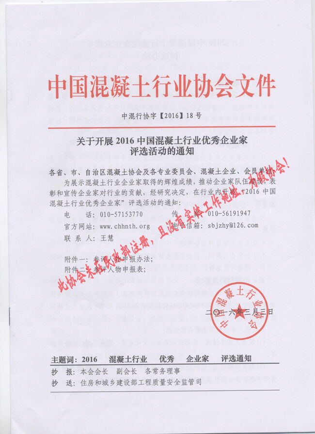 近日,有多家省市協(xié)會(huì)和有關(guān)生產(chǎn)企業(yè)向分會(huì)秘書處反映收到“中國混凝土行業(yè)協(xié)會(huì)”2016(16、17、18、19、20)文件開展所謂的“中國混凝土行業(yè)評(píng)選活動(dòng)”的通知。