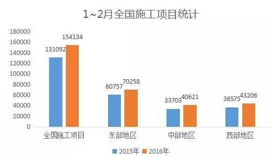 今年1~2月,全國施工項(xiàng)目154134個,比去年同期增加23042個。其中,東部地區(qū)施工項(xiàng)目70258個,增加9501個;中部地區(qū)施工項(xiàng)目40621個,增加6918個;西部地區(qū)施工項(xiàng)目43206個,增加6631個。