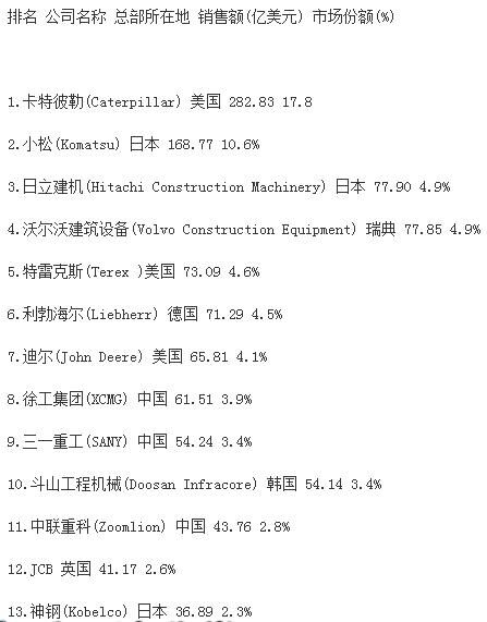 分析指出,受大宗商品價格下跌、新型經(jīng)濟體經(jīng)濟增速減緩和世界經(jīng)濟不景氣的影響,全球前50家工程機械制造企業(yè)總產(chǎn)值較上一年度下跌16.2%,達到1330億美元,創(chuàng)2009年以來新低。據(jù)中國工程機械商貿(mào)網(wǎng)編輯了解,2009年,工程機械行業(yè)一年銷售額下降了1090億美元。自那時起,工程機械行業(yè)收入下降趨勢一直未有改變。報告同時強調,榜單上下滑最為嚴重的是中國企業(yè),這很大程度上是因為中國經(jīng)濟增速的放緩。中國企業(yè)中,只有徐工集團仍然保持在前十強,位列榜單第九位?!斑@個市場趨勢表現(xiàn)最顯著的就是中國建筑設備制造商,相比去年,所有中國企業(yè)的排名有所下滑。排名前十的企業(yè)中,如今只有徐工一家中國工程機械制造廠商?!?/span>